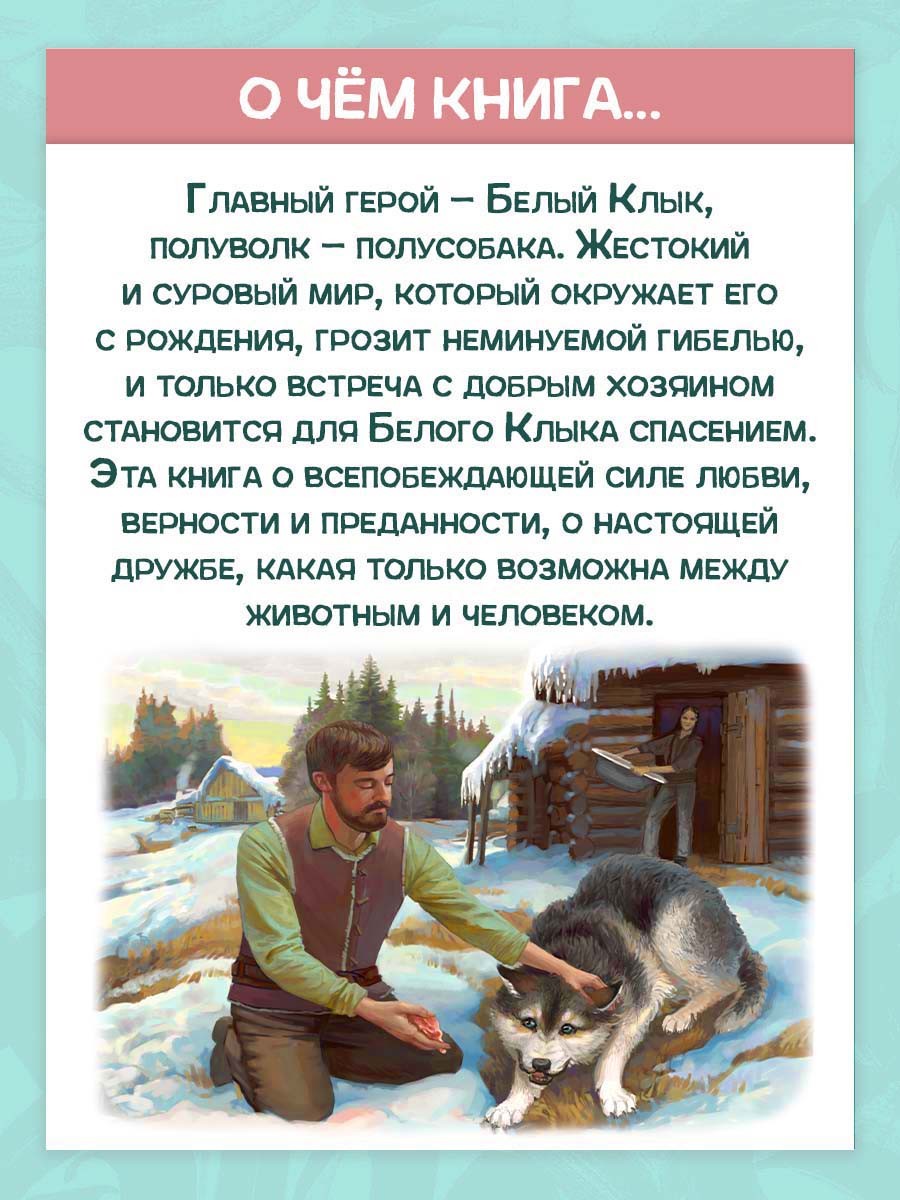 Приключенческая повесть Джека Лондона, главным героем которой является полусобака-полуволк по кличке Белый Клык. Книга рассказывает о судьбе прирученного волка во время золотой лихорадки на Аляске в конце XIX века.